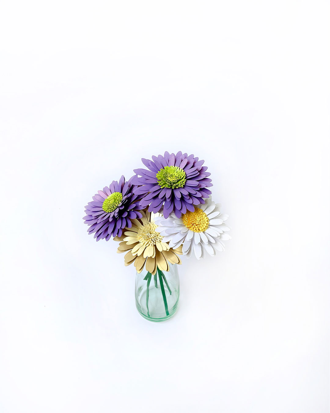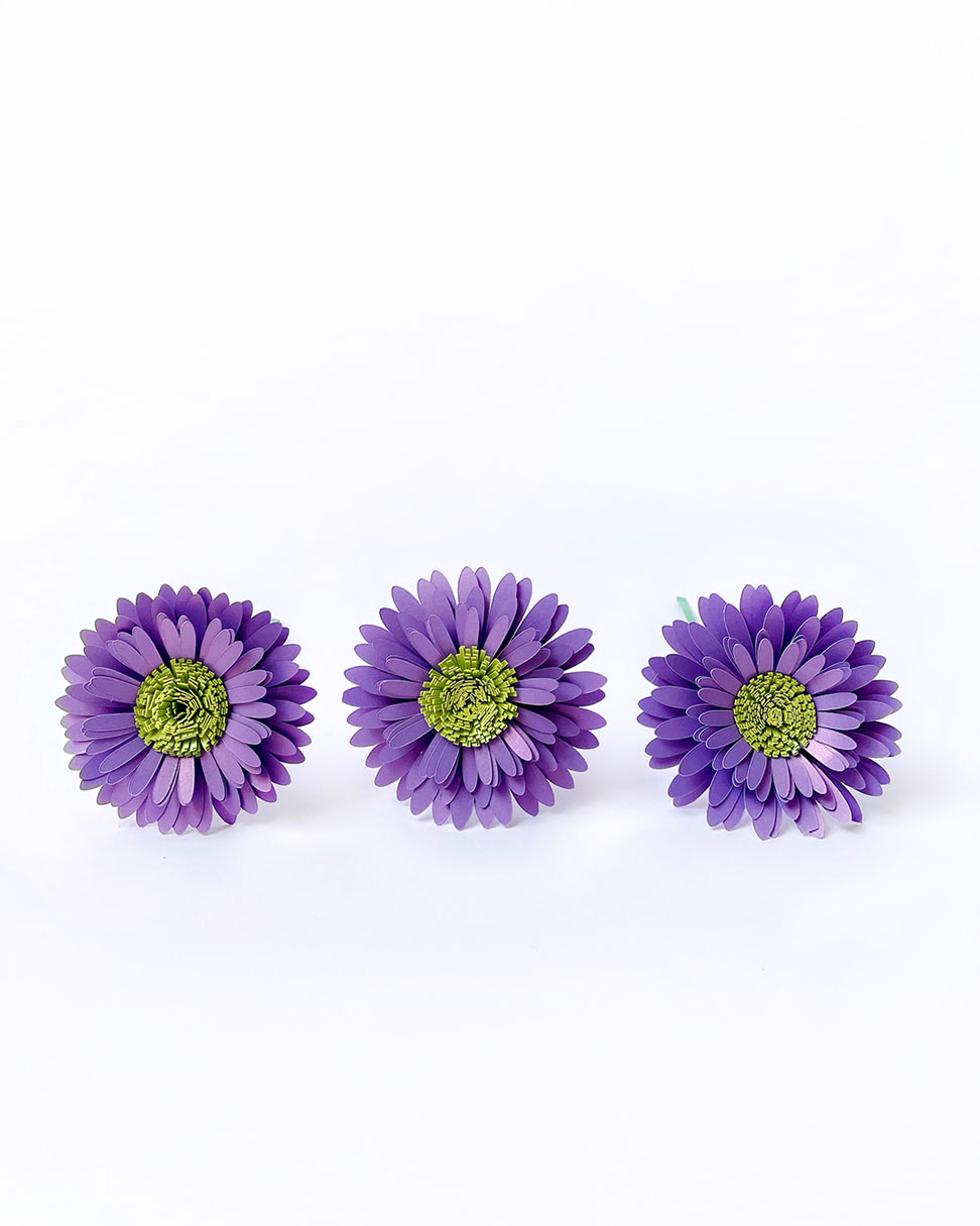 Este kit incluye todo lo que necesitas para crear tres margaritas Moradas en papel, perfectas para darle un toque delicado y natural a tus espacios.